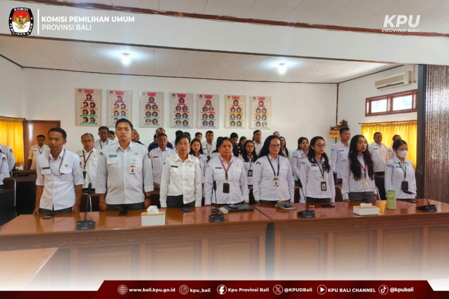 Denpasar, bali.kpu.go.id - Penghayatan Nilai Kebangsaan di lingkungan KPU Provinsi Bali dilaksanakan secara rutin setiap hari kerja pukul 10.00 WITA. Kegiatan ini diisi dengan mendengarkan lagu kebangsaan Indonesia Raya dan pembacaan teks Pancasila setiap hari (Senin–Jumat), serta pembacaan Panca Prasetya KORPRI setiap hari Rabu. Seluruh pegawai KPU Provinsi Bali berdiri tegak dan mengikuti prosesi secara serempak sebagai wujud penghormatan terhadap simbol-simbol negara serta penguatan semangat nasionalisme. (bt.limp/Foto KPU Bali/bt/hupmas)