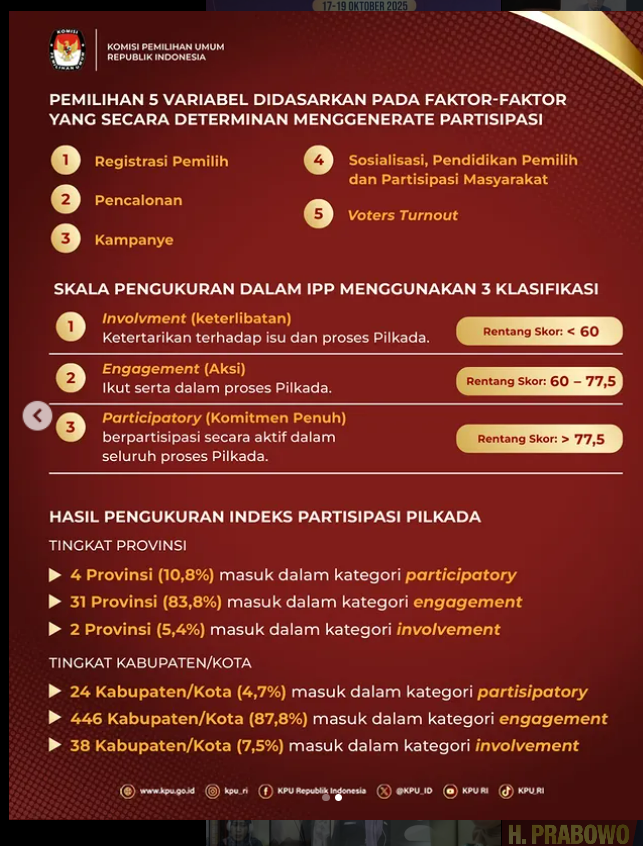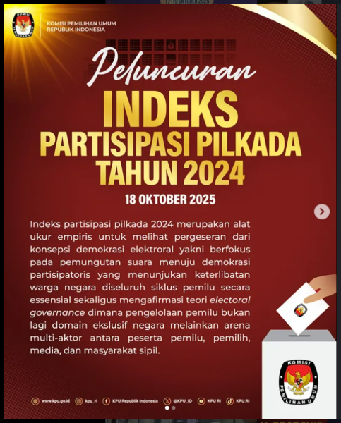 #TemanPemilih, KPU RI meluncurkan Indeks Partisipasi Pilkada (IPP) Tahun 2024, sebagai alat ukur empiris untuk melihat keterlibatan warga negara dalam seluruh siklus Pilkada, mulai dari pendaftaran pemilih, pencalonan, kampanye, hingga hari pemungutan suara.