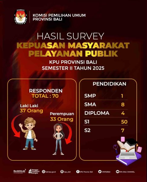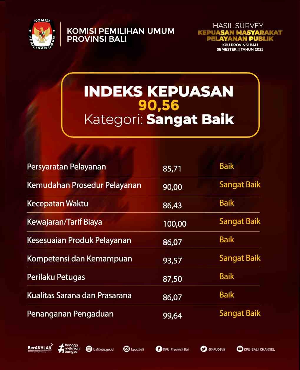 Terima kasih atas kepercayaan dan partisipasi #TemanPemilih yang telah berkontribusi dalam pengisian Survei Kepuasan Masyarakat (SKM) terhadap kinerja KPU Provinsi Bali pada Semester II periode Juli–Desember 2025. Hasil survei menunjukkan Indeks Kepuasan Masyarakat (IKM) sebesar 3,62 atau nilai konversi 90,56 dengan mutu pelayanan “Sangat Baik”. Capaian ini menjadi cerminan apresiasi masyarakat atas layanan yang telah kami berikan.