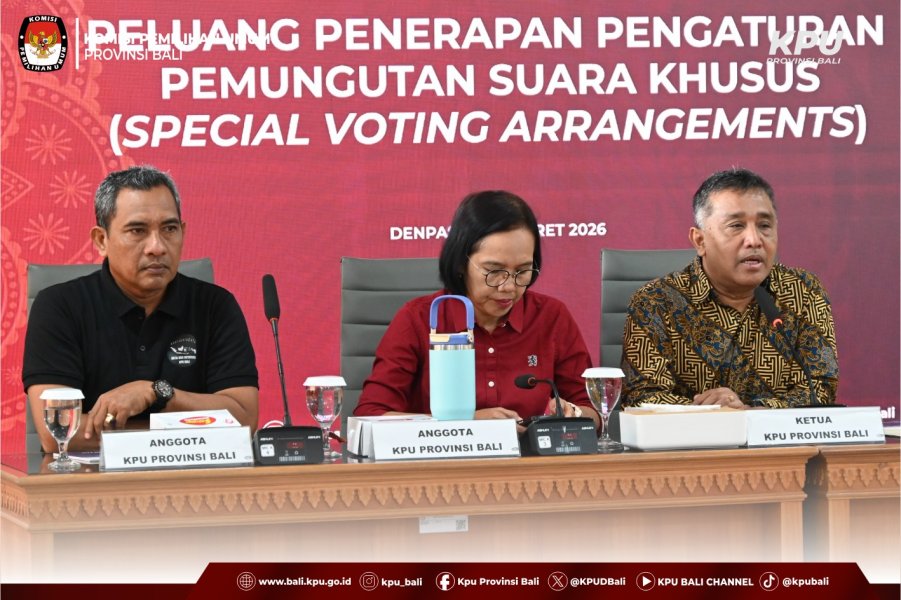 Denpasar, bali.kpu.go.id - Komisi Pemilihan Umum (KPU) Provinsi Bali menggelar Forum Diskusi Terpumpun (FGD) untuk membahas peluang penerapan pengaturan pemungutan suara khusus atau Special Voting Arrangements (SVA). Kegiatan tersebut dilaksanakan di Ruang Rapat Lantai II Kantor KPU Provinsi Bali pada Jumat (13/3/2026). FGD ini dihadiri oleh Ketua dan Anggota KPU Provinsi Bali, Sekretaris KPU Provinsi Bali, perwakilan Badan Kesatuan Bangsa dan Politik Provinsi Bali, serta Ketua dan Anggota Divisi Teknis Penyelenggaraan KPU Kabupaten/Kota se-Bali.