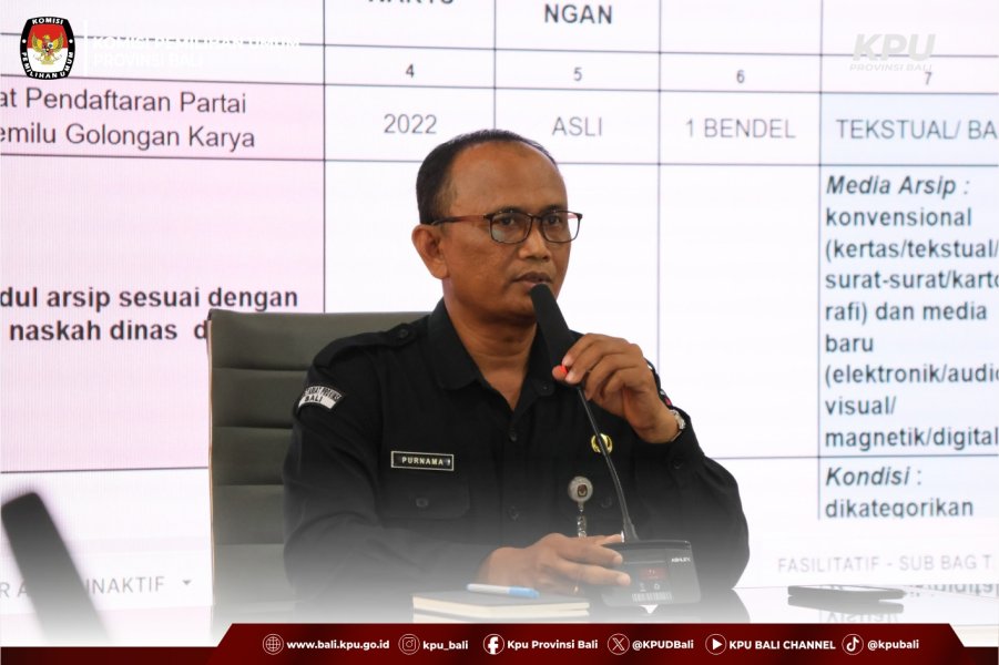 Kepala Bagian Umum dan Logistik KPU Provinsi Bali, Santi Chovarida, menyampaikan bahwa KPU Provinsi Bali telah melaksanakan pemusnahan arsip periode 2003–2019. Ia menekankan pentingnya peran subbagian sebagai unit pengolah (hulu) dalam penataan arsip sesuai ketentuan tata naskah dinas dan Jadwal Retensi Arsip (JRA), sehingga mempermudah pengelolaan di unit kearsipan (hilir). Arsip yang dipindahkan merupakan arsip inaktif, sedangkan arsip aktif tetap berada di masing-masing unit kerja.
