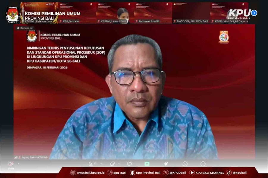 Denpasar, bali.kpu.go.id - Dalam upaya meningkatkan kualitas dan ketepatan produk hukum di lingkungan Komisi Pemilihan Umum (KPU), KPU Provinsi Bali menyelenggarakan Bimbingan Teknis (Bimtek) Penyusunan Keputusan dan Standar Operasional Prosedur (SOP) di lingkungan KPU Provinsi dan KPU Kabupaten/Kota se-Bali. Kegiatan ini dilaksanakan secara daring pada Selasa (10/02/2026).