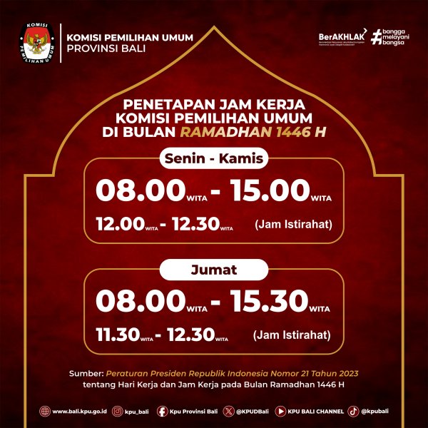 Denpasar, bali.kpu.go.id - Sesuai dengan surat edaran KPU RI Nomor : 682/SDM.04. I-SD/04/2025, prihal Jam Kerja pada Bulan Ramadhan 1446 Hijriah Tahun 2025, Yang menindaklanjuti Peraturan Presiden Republik Indonesia Nomor 21 Tahun 2023 tentang Hari Kerja dan Jam Kerja Instansi Pemerintah dan Pegawai Aparatur Sipil Negara, disampaikan ketentuan jam kerja pegawai di lingkungan Sekretariat Jenderal KPU, Sekretariat KPU Provinsi/KIP Aceh dan Sekretariat KPU/KIP Kabupaten/Kota pada bulan Ramadhan 1446 Hijriah Tahun 2025 sebagai berikut