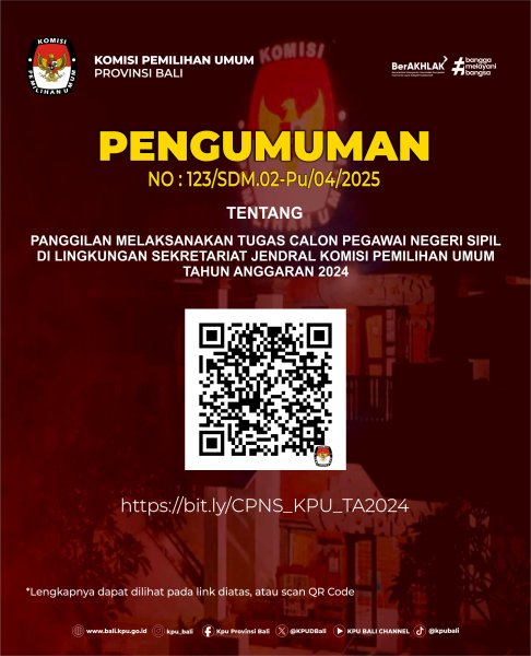 Denpasar, bali.kpu.go.id - Pengumuman Nomor 123/SDM.02-Pu/04/2025 tentang Panggilan Melaksanakan Tugas Calon Pegawai Negeri Sipil di Lingkungan Sekretariat Jenderal Komisi Pemilihan Umum Tahun Anggaran 2024.