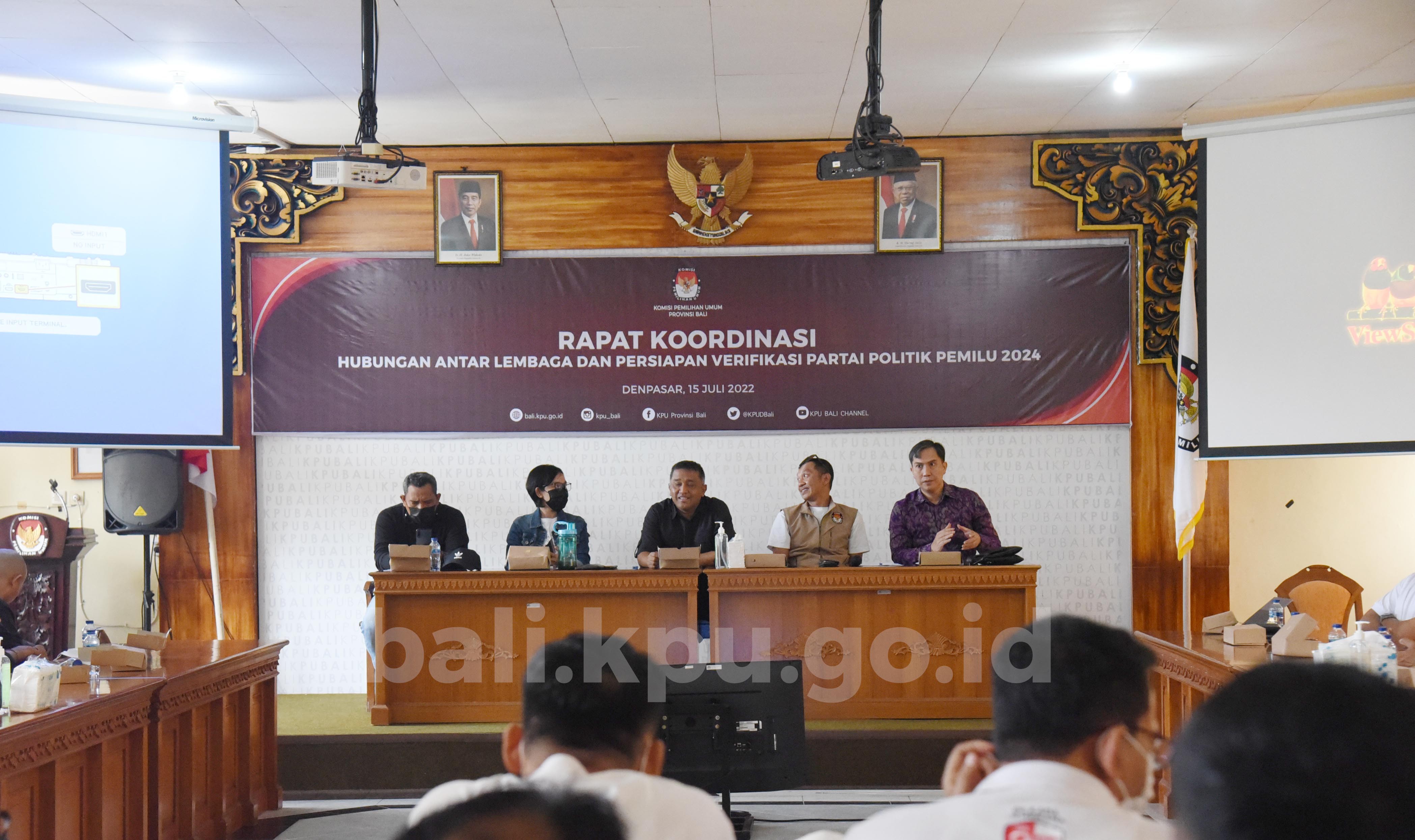 Rapat dibuka oleh Ketua KPU Provinsi Bali I Dewa Agung Gede Lidartawan didampingi keempat Anggota KPU Provinsi Bali Ketua. Pada kesempatan tersebut, hadir Ketua, Anggota Divisi Sosialisasi, Pendidikan Pemilih, Partisipasi Masyarakat dan Sumber Daya Manusia, Anggota Divisi Teknis Penyelenggaraaan Pemilu, Kepala Sub Bagian Teknis Penyelenggaraan Pemilu, Partisipasi dan Hubungan Masyarakat serta Operator Sistem Informasi Partai Politik (SIPOL) KPU Kabupaten/Kota se-Bali sebagai peserta rapat.
