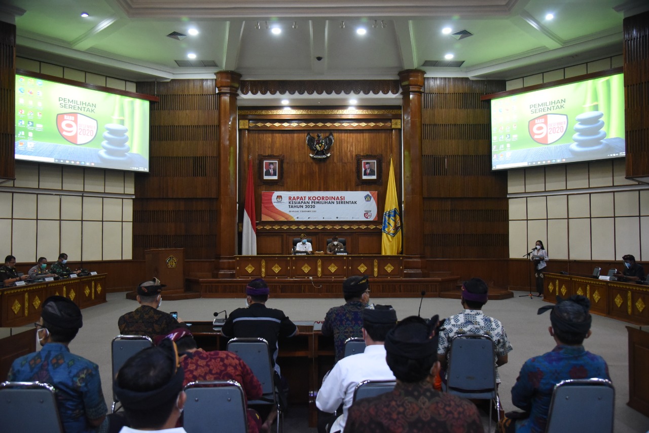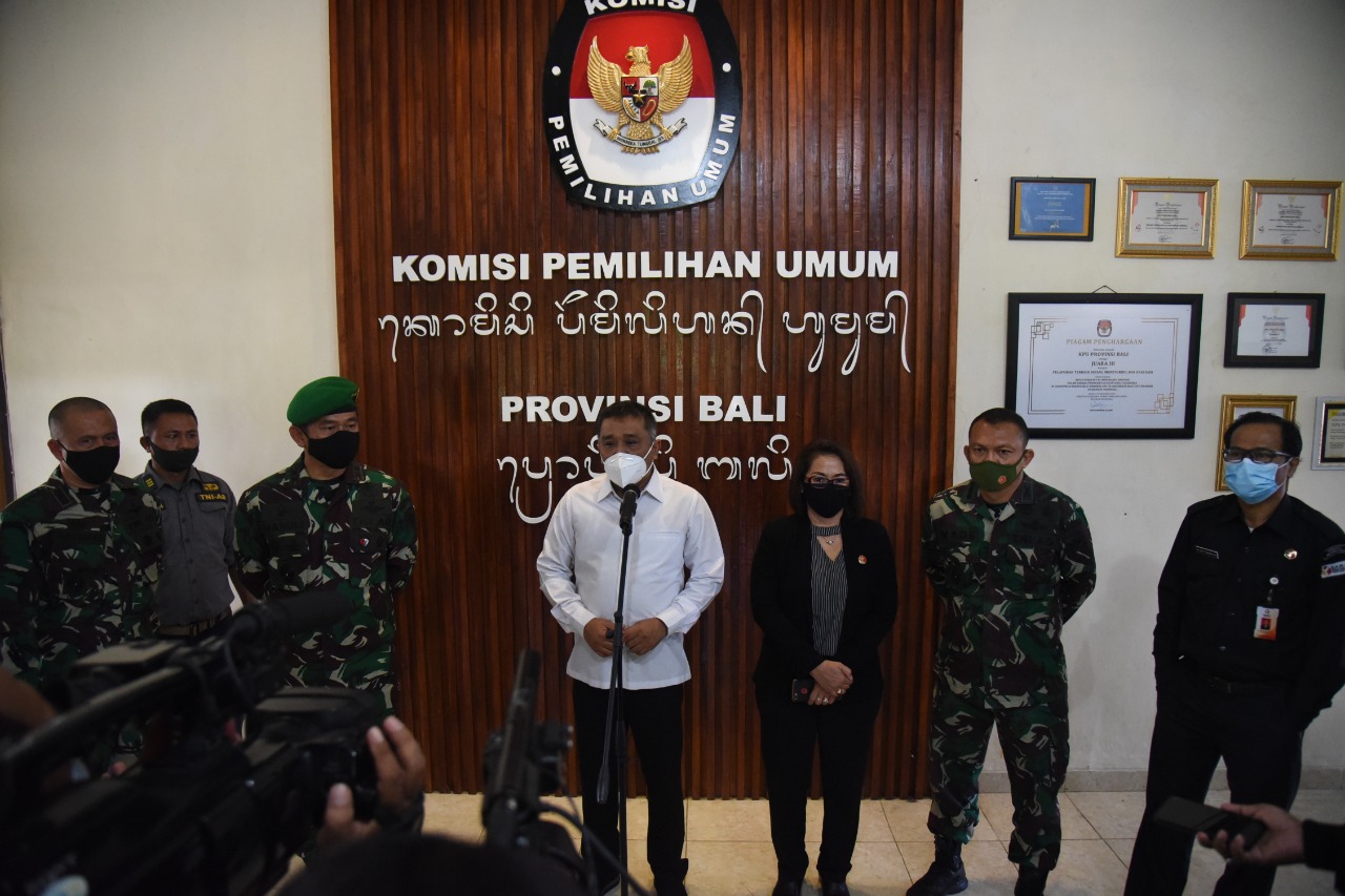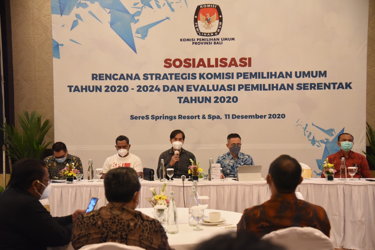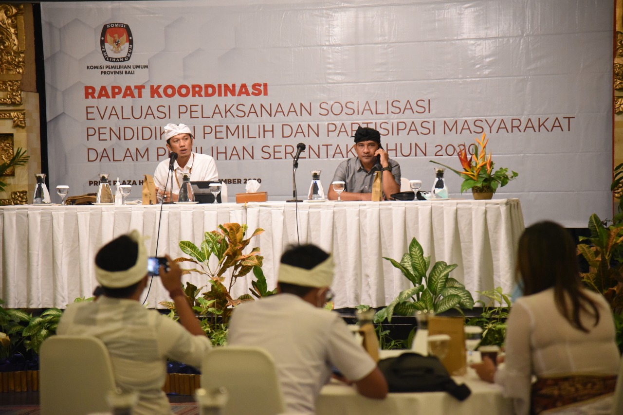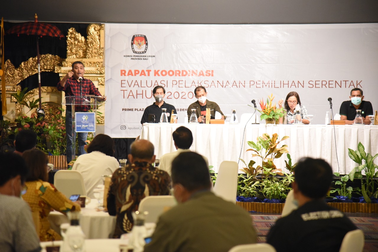 Denpasar, bali.kpu.go.id – Komisi Pemilihan Umum Provinsi Bali melaksanakan Rapat Koordinasi Evaluasi Pelaksanaan Pemilihan Serentak Tahun 2020 di Prime Plaza Hotel Sanur. (13/12/2020) Mengundang Ketua, Anggota dan Sekretaris KPU Kabupaten/Kota penyelenggara pemilihan serentak 2020 serta Ketua KPU Kabupaten Buleleng, Klungkung dan Gianyar, acara dibuka oleh Ketua KPU Bali I Dewa Agung Gede Lidartawan. Dalam sambutannya, Lidartawan meminta kepada jajaran KPU Kabupaten/Kota untuk melakukan inventaris masalah terhadap pelaksanaan tahapan pemilihan serentak 9 Desember 2020 yang lalu sehingga kedepan dapat dilakukan pembenahan atau evaluasi terhadap tahapan-tahapan yang masih dipandang perlu untuk disempurnakan. Lidartawan juga meminta kepada KPU Kabupaten/Kota saat ini untuk fokus kepada tahapan selanjutnya yaitu rekapitulasi di tingkat kabupaten/kota hingga penetapan pasangan calon sehingga dapat berjalan lancar tanpa ada hambatan yang berarti. Selanjutnya masing-masing Anggota KPU Bali melakukan review terhadap pelaksanaan tahapan pada masing-masing divisi KPU Kabupaten/Kota penyelenggara pemilihan. Diakhir kesempatan, Agung Lidartawan beserta seluruh Anggota KPU Bali lainnya mengucapkan terima kasih kepada seluruh jajaran penyelenggara, masyarakat dan stakeholder terkait atas dukungannya dalam mengawal tahapan pemilihan serentak. (gb.red/Foto KPU Bali/gb/hupmas)