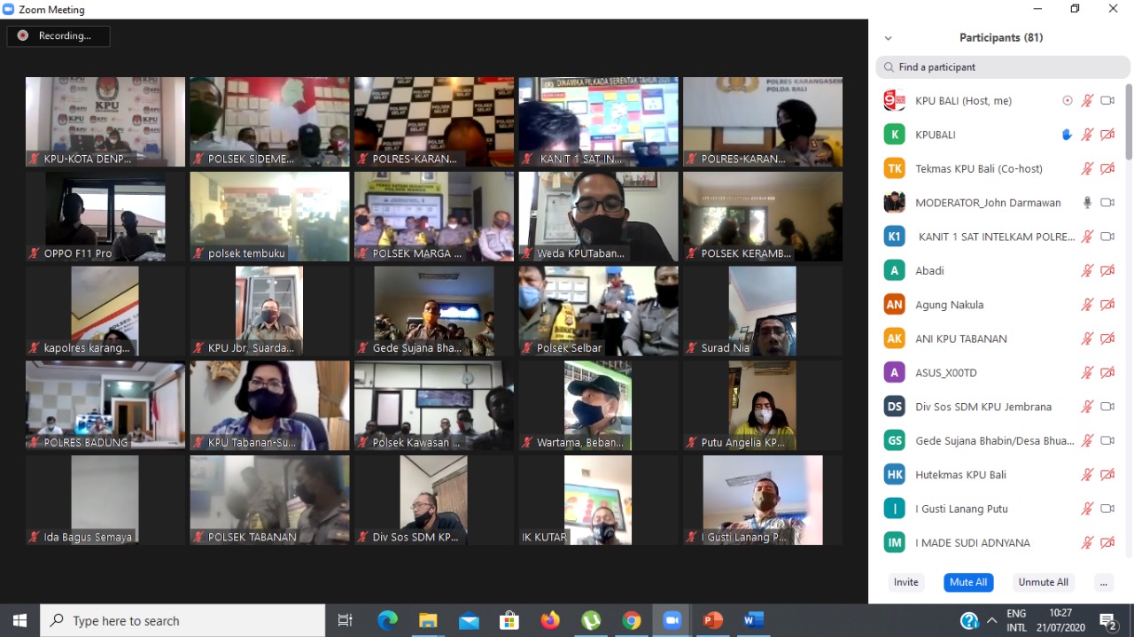 Denpasar, bali.kpu.go.id Sebagai bentuk kesiapan penyelenggara Pemilihan Serentak Tahun 2020 di 6(enam) Kabupaten/Kota Provinsi Bali, Komisi Pemilihan Umum Provinsi Bali melaksanakan sosialisasi kepada jajaran Kepolisian Bali dari tingkat provinsi sampai tingkat desa/kelurahan (Bhabinkamtibmas) dilaksanakan secara daring melalui Zoom Meeting pada Pkl 10.00 WITA (21/07/2020).