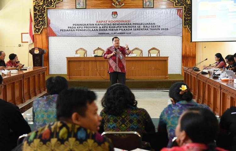 Denpasar, bali.kpup.go.id – Mempersiapkan pelaksanaan Pilkada Serentak 2020 terutama dalam hal pengelolaan Dana Hibah, Komisi Pemilihan Umum Provinsi Bali (KPU Bali) melaksanakan Rapat Koordinasi Peningkatan Kapasitas Bendahara Pengeluaran serta Persiapan Pengelolaan Dana Hibah Pilkada Serentak Tahun 2020 di Ruang Rapat Kantor KPU Provinsi Bali. (15/11/19) Rapat yang mengundang jajaran Sekretaris, Kepala Sub Bagian Keuangan dan Logistik, Bendahara Pengeluaran serta staf pengelola keuangan KPU Kabupaten/Kota se-Bali dibuka oleh Sekretaris KPU Balil I Made Oka Purnama dan mendatangkan Kepala Bagian Perbendaharaan Sekretariat Jenderal KPU RI Yan Permana sebagai narasumber.. Pada kesempatan tersebut, Yan Permana menghimbau kepada seluruh bendahara dan staf pengelola keuangan agar senantiasa bekerja sesuai aturan yang berlaku karena Kuasa Pengguna Anggaran (KPA) bertanggungjawab secara formal terhadap output kegiatan, Pejabat Pembuat Komitmen (PPK) dan Bendahara Pengeluaran bertanggungjawab secara formal dan material, sedangkan PPSPM bertanggungjawab secara formal. Yan Permana juga menghimbau satker yang akan melaksanakan Pilkada di Tahun 2020 agar segera merevisi dana hibah Pilkada ke dalam DIPA, serta membuat SP2HL diupayakan rutin setiap bulan berdasarkan bukti SPJ yang sudah lengkap dengan tepat waktu. (yan/keu/Foto KPU Bali/gb/Humpas)