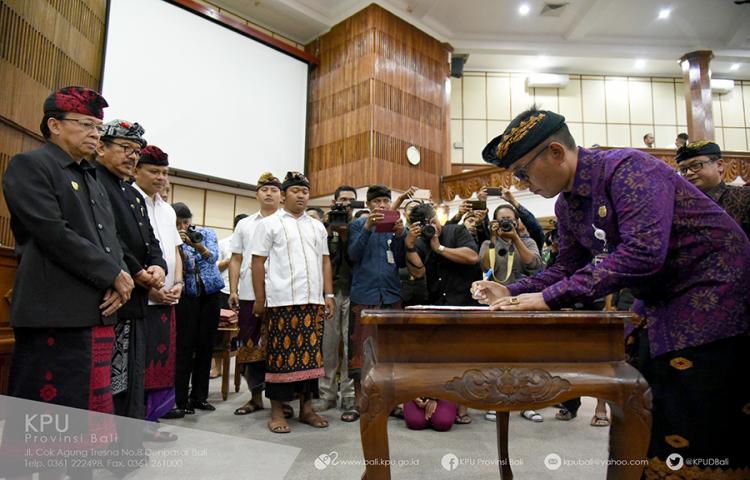 Denpasar, bali.kpu.go.id – Tahapan pelaksaan Pilkada Serentak 2020 6 Kabupaten/Kota (Kota Denpasar, Badung, Tabanan, Jembrana, Bangli dan Karangasem) resmi dimulai dengan penandatanganan Naskah Perjanjian Hibah Daerah (NPHD) secara bersama di Gedung Wiswasabha Utama Kantor Gubernur Bali. (1/10/19) Acara yang dilaksanakan bertepatan dengan Hari Kesaktian Pancasila tersebut dihadiri oleh Gubernur dan Wakil Gubernur Bali, Wakil Ketua DPRD Provinsi Bali, jajaran FKPD Provinsi Bali, Ketua KPU Bali, Ketua Bawaslu Bali, Bupati dan Walikota yang melaksanakan Pilkada, Ketua DPRD Kabupaten/Kota, Ketua KPU Kabupaten/Kota, Ketua Bawaslu Kabupaten/Kota. Sekretaris Daerah Provinsi Bali Dewa Made Indra dalam sambutannya mengatakan bahwa penandatangan NPHD secara serentak merupakan sebuah momentum yang baik dalam menunjukkan komitmen mengawal Bali dengan konsep satu pulau, satu manajemen dan satu komando. Dewa Indra juga mengingatkan akan pentingnya memastikan seluruh tahapan Pilkada mendapat alokasi dana dengan baik, sehingga tidak ada tahapan yang terlewatu dikarenakan oleh anggaran. Dalam kesempatan tersebut, setelah seremoni penandatangan NPHD oleh masing-masinig Kepala Daerah, Ketua KPU Kabupaten/Kota dan Bawaslu Kabupaten/Kota, Gubernur Bali Wayan Koster dalam arahannya menyampaikan, penandatanganan NPHD ini menunjukkan suatu komitmen, keseriusan dan kepastian akan penyelenggaraan Pilkada Serentak 2020 di 6 Kabuapaten/Kota didukung dengan anggaran yang telah diputuskan oleh DPRD bersama Pemerintah Kabupaten/Kota di masing-masing Kabupaten/Kota sesuai dengan kebutuhan peyelenggaraan, pengawasan dan pengamanan. Koster juga menyampaikan rasa terima kasihnya kepada seluruh jajaran kepala daerah (Bupati dan Walikota) dengan persetujuan DPRD Kabupaten/Kota yang telah memberikan dana untuk pelaksanaan Pilkada Serentak yang akan dilaksanakan pada tanggal 23 September 2020. Dikahir arahannya, Koster berharap Pilkada Serentak dapat dijalankan sebaik-baiknya dan dapat memberikan pendidikan politik kepada masyarakat bali pada khususnya. (gb.red/Foto KPU Bali/gb/hupmas)