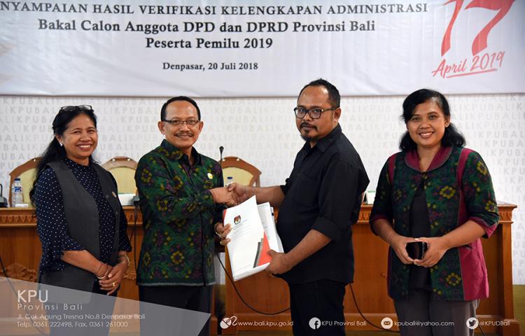 Sejak tanggal 9 hingga 11 Juli 2018, Komisi Pemilihan Umum Provinsi Bali (KPU Bali) disaksikan oleh pihak Bawaslu Bali telah menerima dokumen syarat pendaftaran dari 22 bakal calon DPD yang sebelumnya telah menyerahkan syarat dukungan, baik yang telah dinyatakan Memenuhi Syarat (MS) sebanyak 17 orang maupun yang Belum Memenuhi Syarat (BMS) sebanyak 6 orang pasca rekapitulasi hasil verifikasi faktual syarat dukungan.