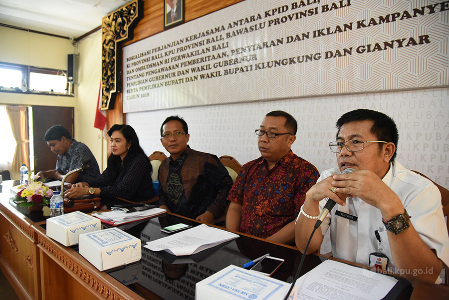 Denpasar, bali.kpu.go.id– Komisi Pemilihan Umum Provinsi Bali (KPU Bali) mengundang jajaran media cetak dan elektronik serta KPU Kabupaten/Kota se-Bali dalam acara Sosialisasi Perjanjian Kerjasama bersama Komisi Penyiaran Indonesia Daerah Bali (KPID Bali), Komisi Informasi Provinsi Bali (KPI Bali), Badan Pengawas Pemilu Provinsi Bali (Bawaslu Bali) dan Ombudsman Republik Indonesia Perwakilan Bali (ORI Bali). (4/3/18) Perjanjian Kerjasama yang mengatur tentang Pengawasan Pemberitaan, Penyiaran dan Iklan Kampanye Pemilihan Gubernur dan Wakil Gubernur Bali (Pilgub Bali), serta Pemilihan Bupati dan Wakil Bupati Klungkung dan Gianyar Tahun 2018 tersebut telah ditandatangani pada tanggal 19 Maret 2018 yang lalu. Plh. Ketua KPU Bali Wayan Jondra dalam sambutannya mengatakan bahwa kegiatan saat ini dilaksanakan sebagai implementasi atas Peraturan KPU Nomor 4 Tahun 2017 tentang Kampanye Pemilihan Gubernur dan Wakil Gubernur, Bupati dan Wakil Bupati dan/atau Walikota dan Wakil Walikota. Sehingga dipandang perlu untuk membentuk gugus tugas untuk menjamin pelaksanaan kampanye Pilgub Bali dapat berjalan sesuai dengan peraturan dan perundang-undangan yang berlaku sebagaimana tertuang dalam Perjanjian Kerjasama tersebut. Jondra juga menambahkan bahwa dalam mengawal pelaksanaan Pilgub Bali yang akan dilaksanakan pada tanggal 27 Juni 2018 mendatang, KPU Bali tidak dapat bekerja sendiri. Dukungan dari masyarakat dan awak media sangat dibutuhkan terutama dalam penyampaian informasi dalam mendukung asas transparansi. Anggota KPU Bali Divisi SDM dan Partisipasi Masyarakat Ni Wayan Widhiasthini dalam kesempatan tersebut juga memaparkan lebih dalam mengenai gugus tugas dari masing-masing lembaga terkait serta perkembangan pemasangan Alat Peraga Kampanye (APK) yang saat ini telah terpasang seluruhnya di titik yang telah ditentuka di Provinsi Bali. Widhiasthini juga menyampaikan mengenai jadwal Debat Publik yang nantinya akan dilaksanakan sebanyak tiga kali masing-masing pada tanggal 28 April 2018, 26 Mei 2018 dan 22 Juni 2018. Acara dilanjutkan dengan paparan singkat dari Ketua Bawaslu Bali, Ketua Komisi Informasi Bali, Anggota Komisi Penyiaran Indonesia Daerah Bali dan Ketua Ombudsman RI Perwakilan Bali. (gb.red/Foto KPU Bali/gb/Hupmas)
