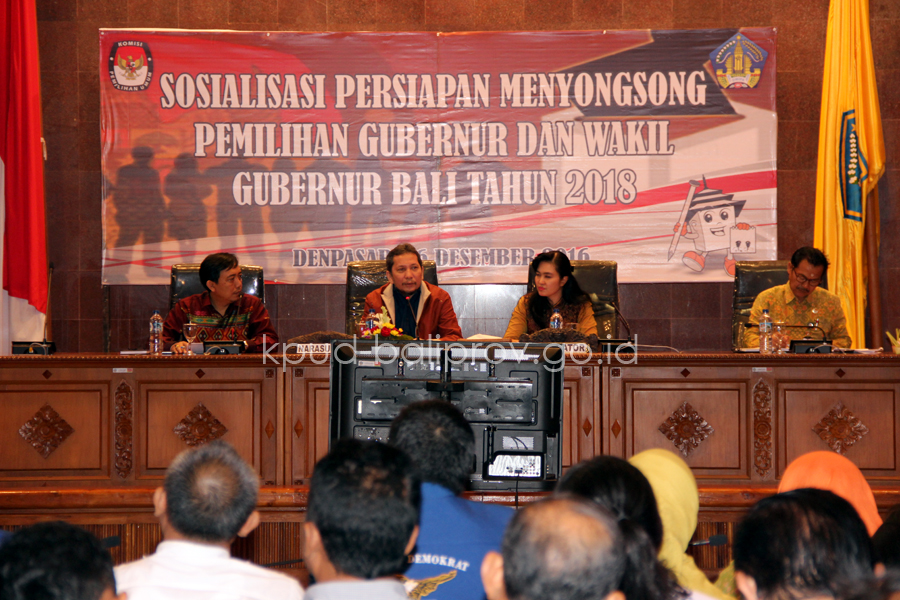 Mendekati perhelatan Pilgub Bali yang akan dilaksanakan pada tahun 2018 mendatang, Komisi Pemilihan Umum Provinsi Bali bersama Kesbangpol Provinsi Bali melaksanakan acara Sosialisasi Persiapan Menyongsong Pilgub Bali Tahun 2018. Acara yang mengundang Forum Komunikasi Pimpinan Daerah (FKPD) Provinsi Bali, Ketua Bawaslu Provinsi Bali, Ketua KPID Provinsi Bali, Ketua KI Provinsi Bali, Kepala Ombudsman Perwakilan Bali, jajaran SKPD terkait Provinsi Bali, Universtas/Sekolah di Denpasar, Pimpinan Partai Politik, Ormas/LSM serta rekan media massa dan elektronik di provinsi Bali ini dilaksanakan di Gedung Wiswasabha Utama Setda Provinsi Bali. (16/12/16) Acara dibuka oleh Gubernur Bali Made Mangku Pastika. Dalam sambutannya Pastika mengatakan bahwa KPU Bali sudah mengambil langkah tepat untuk melaksanakan sosilisasi persiapan Pilgub 2018 kepada seluruh masyarakat dan stakeholder terkait, sehingga pihak-pihak yang terlibat dapat memahami fungsinya masing-masing. Sebagai penyelenggara, KPU nantinya diharapkan tidak hanya memperkenalkan para calon kandidat dari sisi baiknya saja, tetapi juga mempublikasikan segala hal yang kurang baik (negative record) kepada masyarakat. Sehingga masyarakat dapat lebih bijak dalam memilih sosok yang akan menjadi pemimpinnya kelak. Masa depan Bali kedepan sangat tergantung oleh seperti apa sosok pemimpin yang terpilih kedepannya. Baik tidaknya kualitas pemimpin yang dihasilkan nanti merupakan tanggungjawab penuh penyelenggara dan partai politik. Jadi kedepannya diharapkan kepada jajaran komisioner agar lebih bekerja keras dalam menciptakan suatu proses melahirkan pemimpin yang baik dan berkualitas.“Pemimpin dapat membawa suatu daerah menuju gerbang keemasan ataupun ke gerbang kehancuran” tegasnya. Sesi dilanjutkan dengan pemaparan oleh narasumber dari Anggota Ombudsman Republik Indonesia dengan tema “Peran Ombudsman dalam Pilgub – Mendorong Pemerintahan Bersih Maladministrasi”, Ketua KPU Provinsi Bali dengan tema “Kesiapan KPU Bali dalam Pelaksanaan Pilgub 2018”, Anggota Bawaslu Provinsi Bali dengan tema “Pengawasan Pelaksanaan Pilkada 2018”, Perwakilan dari Polda Bali dengan tema “Kesiapan Pengamanan – Hastasiap” didampingi Anggota Provinsi Bali sebagai moderator. (gb.red/Foto KPU Bali/gb/Hupmas)