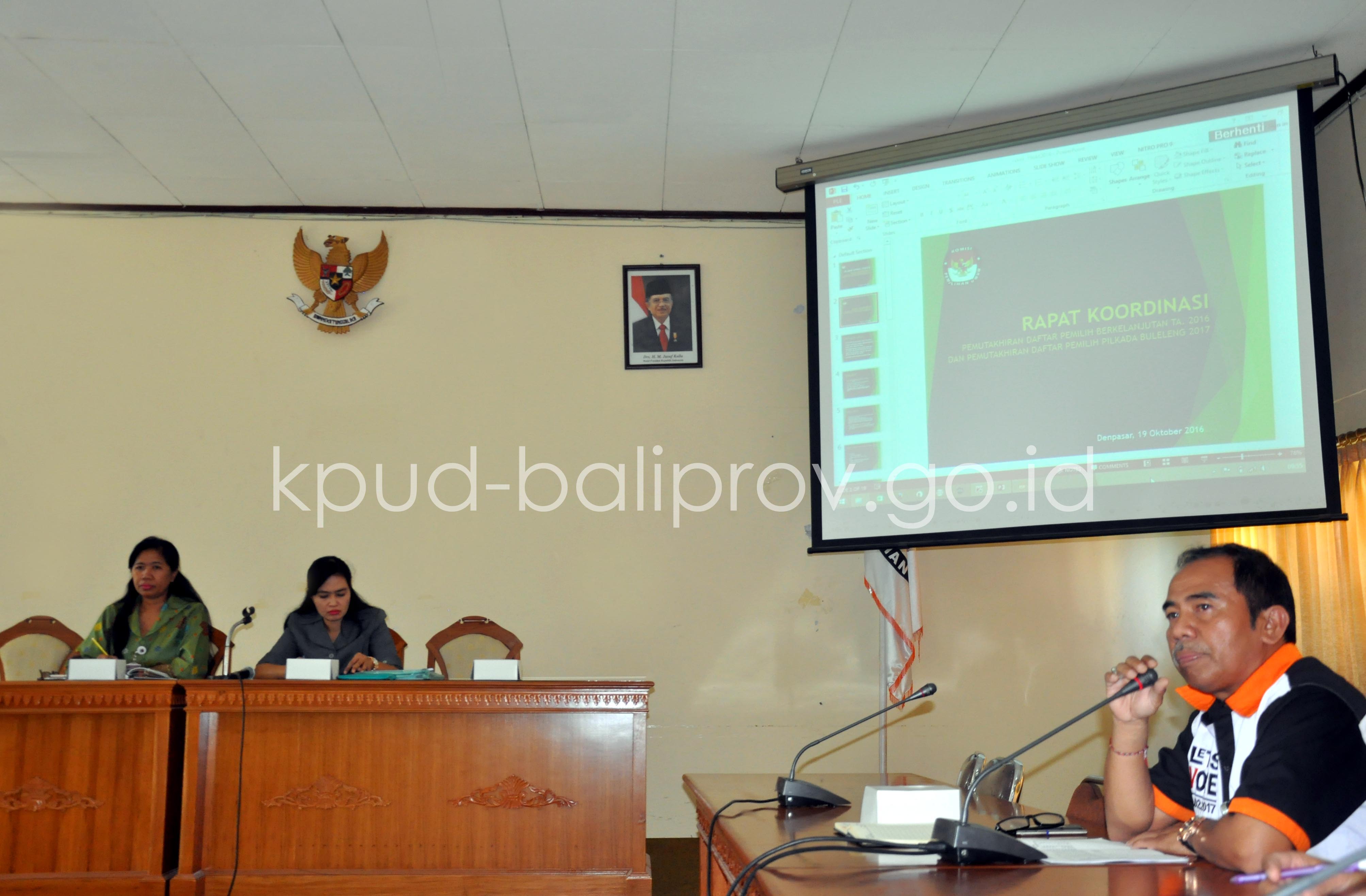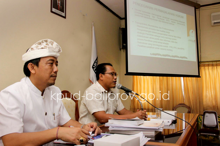 Komisi Pemilihan Umum Provinsi Bali melaksanakan Rapat Koordinasi Sosialisasi Persiapan Penyelesaian Sengketa Tata Usaha Negara Pemilihan Gubernur dan Wakil Gubernur, Bupati dan Wakil Bupati dan/atau Walikota dan wakil Walikota Tahun 2017. (14/10) Rapat koordinasi yang dihadiri oleh Ketua dan Komisioner serta pejabat struktural KPU Provinsi Bali diselenggarakan untuk memantapkan persiapan Pilkada Buleleng tahun 2017 ini dibuka oleh Ketua KPU Provinsi Bali I Dewa Kade Wiarsa Raka Sandi. Selain menyampaikan sambutannya, Dewa Raka Sandi juga memaparkan materi dengan menekankan pada peraturan-peraturan dan proses Pilkada untuk menghindari sengketa yang harus dipahami oleh seluruh KPU se-Bali dan KPU Buleleng pada khususnya sebagai penyelenggara yang dalam waktu dekat ini akan melaksanakan Pilkada. Dalam rapat tersebut diundang komisioner KPU Kabupaten/Kota se-Bali dan pejabat struktural yang membidangi dan dihadiri pula oleh Andi Krisna Kepala Bagian Advokasi dan Penyelesaian Sengketa Hukum Setjen KPU RI selaku pemberi materi menyampaikan pemaparan berkaitan dengan penyelesaian sengketa dan pendampingan hukum jika terjadi sengketa dalam pelaksanaan Pemilu. Berdasarkan pemaparan yang disampaikan, ada beberapa aspek penting yang harus disiapkan apabila terjadi sengketa. Salah satu diantaranya ialah mengenai pemahaman tentang sengketa dan pentingnya standar prosedur dalam penyelenggaraan Pemilu yang baik. Selain pembahasan tentang penyelesaian sengketa hukum, disampaikan pula tentang Tahapan Kampanye yang dipaparkan oleh Anggota KPU Provinsi Bali Ni Wayan Widhiasthini dilanjutkan dengan pemaparan Tahapan Audit Dana Kampanye oleh Anggota KPU Provinsi Bali Ni Putu Ayu Winariati. Dengan berlangsungnya rapat koordinasi ini diharapkan dapat meminimalisir terjadinya sengketa Pemilu khususnya bagi KPU Buleleng yang akan melaksanakan Pilkada pada tahun 2017 nanti.