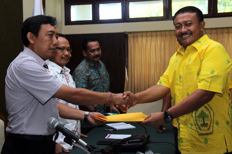 Gde Sumarjaya Linggih menyerahkan Surat Keputusan Penunjukan Pelaksana Tugas Pengurus DPD Partai Golkar Provinsi Bali kepada Ketua KPU Provinsi Bali, hari Kamis (30/4/2015). Kedatangan Partai GOLKAR yang dipimpin oleh Gede Sumarjaya Linggih yang juga sebagai Ketua Pelaksana Tugas Pengurus DPD I Partai Golkar Provinsi Bali didampingi oleh Dewa Widiyasa Nida dan pengurus lainnya diterima oleh Ketua KPU Provinsi Bali, Dewa Raka Sandi, Anggota dan Sekretaris KPU Provinsi Bali. Sumarjaya Linggih menyebutkan berkas yang diserahkan kepada KPU Provinsi Bali diantaranya adalah Keputusan Kemenkumham Nomor M.HH-01.AH.11.01 Tahun 2015 tentang Pengesahan Perubahan Anggaran Dasar, Anggaran Rumah Tangga serta Komposisi dan Personalia Dewan Pimpinan Pusat Partai GOLKAR, Amar putusan Mahkamah Konstitusi Partai GOLKAR dan Surat Keputusan DPP Nomor Kep-28/DPP/GOLKAR/III/2015 tentang Penunjukan Pelaksana Tugas Pengurus DPD Partai GOLKAR Provinsi Bali yang ditandatangani oleh Ketua Umum HR. Agung Laksono dan Sekretaris Jendral Zainudin Amali. Hal ini untuk memperkuat dasar hukum bagi Partai GOLKAR dalam pelaksanaan pesta demokrasi Pemilihan Umum Kepala Daerah dan Wakil Kepala Daerah Tahun 2015 yang dilaksanakan secara serentak di 6 Kabupaten/Kota di Provinsi Bali. Menanggapi hal tersebut, Ketua KPU Provinsi Bali, Dewa Raka Sandi menyampaikan bahwasanya KPU Provinsi Bali dan KPU Kabupaten/Kota yang melaksanakan Pilkada menunggu arahan dan petunjuk lebih lanjut dari KPU RI. Selain itu jajaran KPU Provinsi Bali juga berharap agar semua pihak tetap menjaga kondusivitas Bali selama penyelenggaraan Pilkada Tahun 2015.