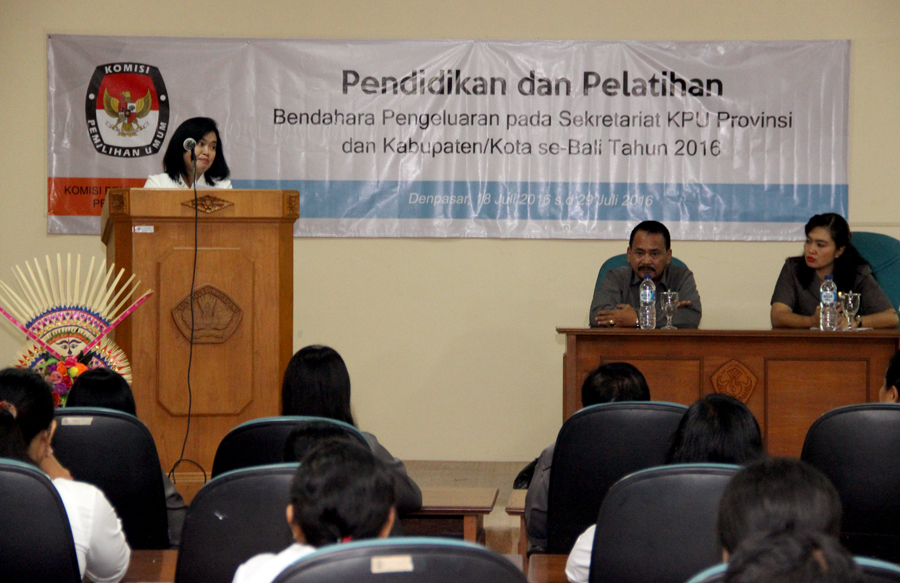 Dalam sambutannya, Dr. Ni Wayan Widhiasthini, S.Sos,M.Si menyampaikan Diklat yang dilaksanakan tanggal 18 Juli sampai dengan 29 Juli 2016 dengan peserta dari bendahara pengeluaran KPU Kabupaten/kota se-Bali ini dimaksudkan agar peserta menjadi Bendahara yang bersertifikat dan mampu bertanggung jawab atas laporan pertanggungjawaban anggaran yang berbasis kinerja.
