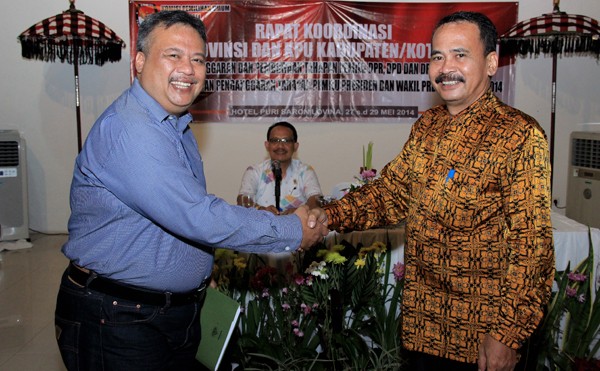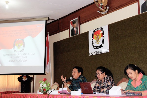 Menindaklanjuti Surat Keputusan KPU Nomor 457/Kpts/KPU/Tahun 2014 tanggal 3 Juni 2014 tentang Jadual Kampanye Rapat Umum dalam Pemilihan Umum Presiden dan Wakil Presiden Tahun 2014 dan Surat Edaran KPU Nomor 1250/KPU/VI/2014 tanggal 6 Juni 2014 tentang Kampanye Rapat Umum Pemilu Presiden dan Wakil Presiden, Komisi Pemilihan Umum Provinsi Bali melaksanakan Rapat Sosialisasi dan Koordinasi dengan Tim Kampanye Calon Presdien dan Wakil Presiden Tahun 2014, Bawaslu Provinsi Bali, Polda Bali, Ketua KPU Kabupaten/Kota se-Bali, dan Instansi terkait lainnya pada tanggal 10 Juni 2014. Rapat yang dilaksanakan di Ruang Rapat KPU Provinsi Bali tersebut dipimpin oleh Ketua KPU Bali Dewa Raka Sandi. Dalam kesempatan tersebut, Raka Sandi mengatakan untuk Kampanye Pilpres saat ini berbeda dengan kampanye pada Pemilu Anggota DPR, DPD dan DPRD Tahun 201. Jika pada Kampanye Pemilu sebelumnya Kampanye diatur melalui Zonasi yang telah disepakati bersama, sedangkan untuk Pilpres saat ini Kampanye masing-masing calon dapat berkampanye selama jadwal yang telah disediakan oleh KPU. Berdasarkan pemberitahuan jadwal Kampanye dari KPU, Pasangan Calon Nomor 1 akan melaksanakan Kampanye di Provinsi Bali pada tanggal 24 Juni 2014, sedangkan untuk Pasangan Calon Nomor 2, dari tanggal 6, 12, 17, 23 dan 28 Juni 2014. Dalam kesempatan tersebut, Dewa Raka Sandi juga menekankan kepada seluruh Tim Kampanye masing-masing Pasangan Calon agar memberitahukan kepada Pihak Kepolisian paling lambat 7 hari sebelum pelaksanaan Kampanye dan ditembuskan kepada KPU dan Bawaslu sesuai tingkatannya. Mengingat jadwal Kampanye Rapat Umum bersifat terbuka dan didasarkan pada inisiatif Tim Kampanye masing-masing pasangan Calon, dihimbau agar semua pihak melakukan koordinasi sehingga tidak terjadi benturan atau tumpang tindih jadwal "Mari kita bersama-sama menjaga keamanan Bali selama pelaksanaan Kampanye" imbuhnya.