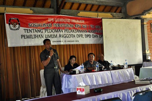 Ketua KPU Provinsi Bali, Lanang Perbawa, menjelaskan tentang Peraturan KPU Nomor 1 Tahun 2013 tentang Pedoman Pelaksanaan Kampanye Pemilihan Umum Anggota DPR, DPD, dan DPRD. Ia menekankan, dalam kampanye harus memperhatikan lima prinsip, yakni efisien, ramah lingkungan, akuntabel, nondiskriminasi dan tanpa kekerasan. "Lima prinsip ini perlu dijaga oleh peserta pemilu," katanya.
