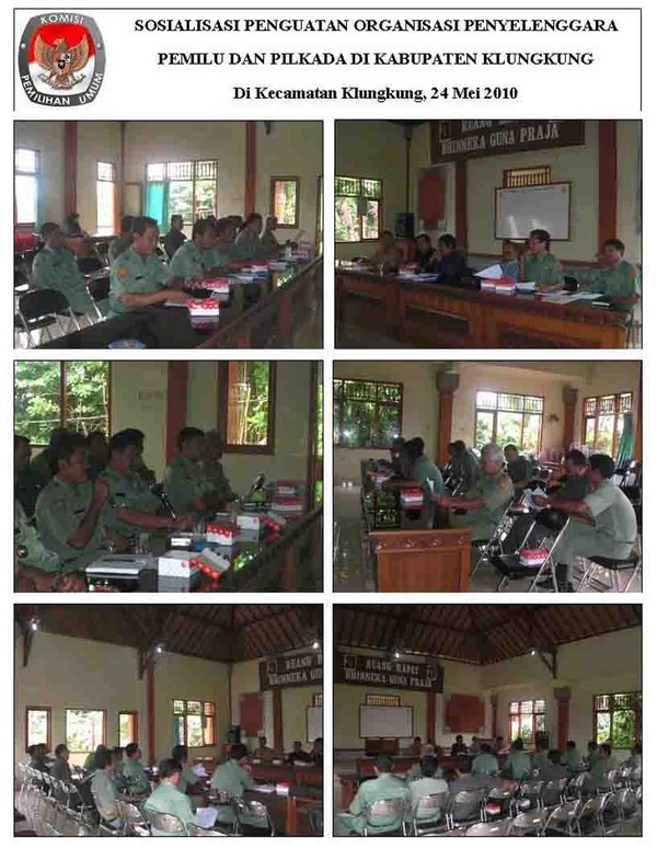 Sosialisasi Penguatan Organisasi di KPUD Kabupaten Klungkung Sosialisasi Penguatan Organisasi Penyelenggara Pemilu dan Pilkada di Kabupaten Klungkung dilaksanakan di masing-masing kecamatan, mulai tanggal 24 Mei 2010 sampai dengan tanggal 27 Mei 2010. Sosialisasi ini dihadiri oleh seluruh Kepala Desa/Lurah di masing-masing kecamatan di Kabupaten Klungkung. Dimana yang bertindak sebagai pembicara adalah Ketua dan Anggota Komisi Pemilihan Umum Kabupaten Klungkung. Pada penyelenggaraan Sosialisasi Penguatan Kelembagaan kepada Camat dan Kepala Desa/Lurah tersebut, KPU selain menyampaikan keberadaan KPU, tugas pokok dan fungsi KPU, KPU Provinsi dan KPU Kabupaten/Kota sesuai dengan Undang-Undang Nomor 22 Tahun 2007 tentang Penyelenggara Pemilihan Umum, juga menyampaikan keberadaan dan tugas pokok Panitia Pemilihan Kecamatan (PPK), Keberadaan Panitia Pemungutan Suara (PPS), tugas pokok dan fungsinya, serta mekanisme pembentukan dari lembaga pengelenggara Pemilu tersebut (PPK, PPS serta KPPS). Dan persyaratan yang mesti dipenuhi sebagai anggota PPK, PPS dan KPPS serta hal-hal yang penting yang diperhatikan secara serius atau optimal oleh PPK dan PPS dalam penyelenggaraan Pemilu seperti Daftar Pemilih Sementara (DPS), Daftar Pemilih Tetap (DPT), kampanye, pemungutan dan penghitungan suara yang merupakan gong dari kegiatan demokrasi yang disebut Pemilu.