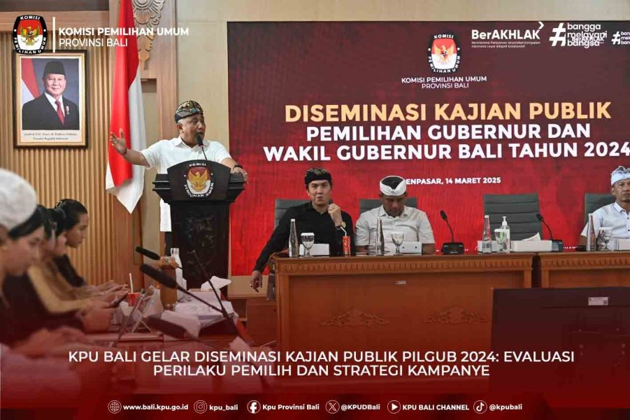 Denpasar, bali.kpu.go.id - Komisi Pemilihan Umum Provinsi Bali menggelar Diseminasi Kajian Publik Pemilihan Gubernur dan Wakil Gubernur Bali 2024. Bertempat di Ruang Rapat Lt. II Kantor KPU Provinsi Bali, acara ini dihadiri oleh berbagai pihak, termasuk Ketua dan Anggota KPU Bali, Sekretaris KPU Bali, Ketua dan anggota KPU Kabupaten/Kota Divisi Parmas dan SDM se-Bali, serta perwakilan Forkopimda, Bawaslu, Badan Kesatuan Bangsa dan Politik, pimpinan partai politik, dan penggiat pemilu. Kegiatan ini bertujuan untuk mengevaluasi perilaku pemilih serta strategi kampanye guna meningkatkan kualitas demokrasi di Bali. Jumat, 14 Maret 2025