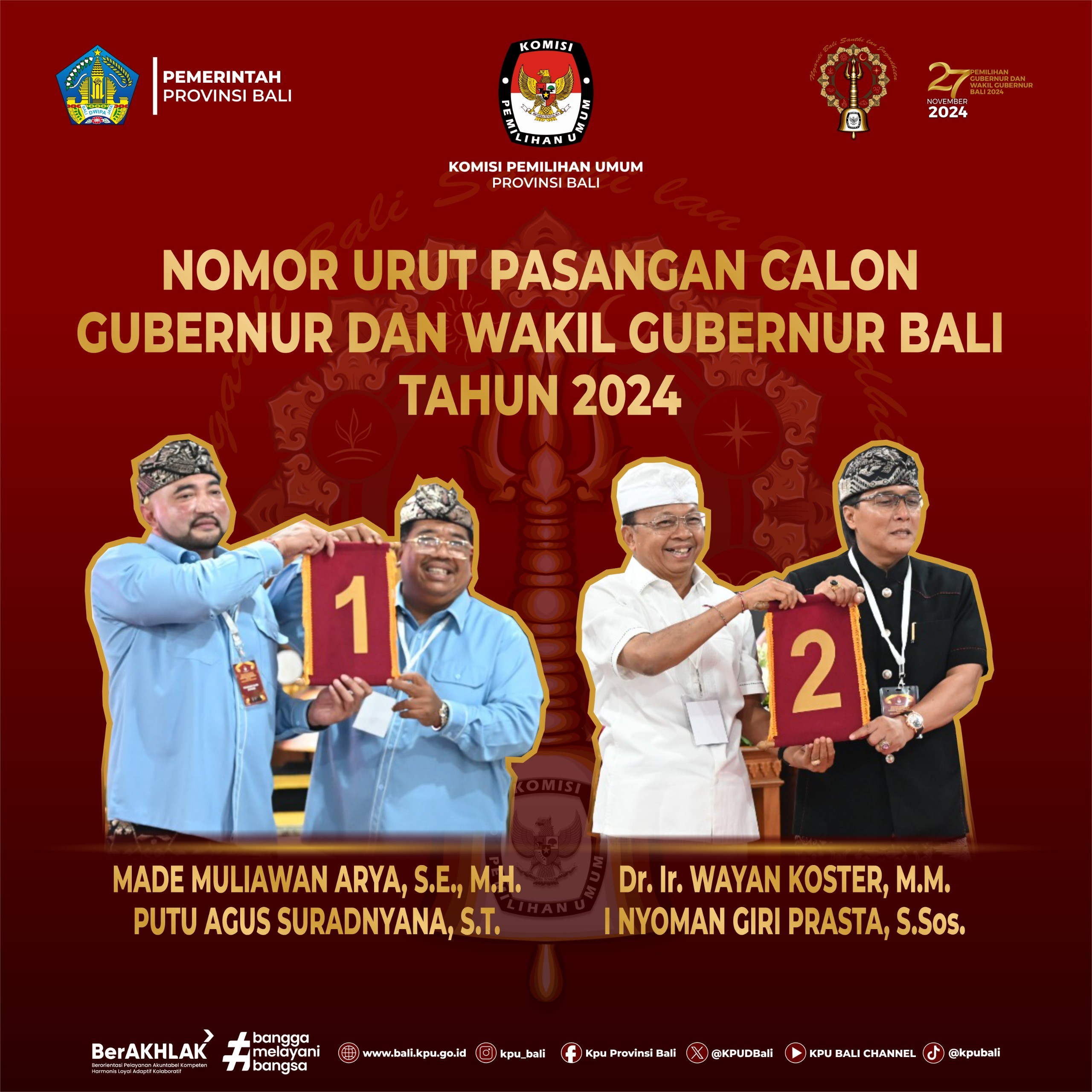 Denpasar, bali.kpu.go.id- Memperhatikan Peraturan Komisi Pemilihan Umum Nomor 2 Tahun 2024 tentang Tahapan dan Jadwal Pemilihan Gubernur dan Wakil Gubernur, Bupati dan Wakil Bupati, serta Walikota dan Wakil Walikota Tahun 2024, KPU Provinsi Bali telah melaksanakan Pengundian dan Penetapan Nomor Urut Pasangan Calon Gubernur dan Wakil Gubernur Bali Tahun 2024 di Komisi Pemilihan Umum Provinsi Bali. Dalam prosesi Pengundian dan Penetapan Nomor Urut Pasangan Calon Gubernur dan Wakil Gubernur Bali Tahun 2024, Calon Wakil Gubernur Bali diberikan kesempatan untuk mengambil nomor undian untuk mengambil nomor urut sesuai dengan waktu pendaftaran pasangan calon. Kesempatan pertama diberikan kepada Calon Wakil Gubernur I Nyoman Giri Prasta, S.Sos untuk mengambil nomor undian dan memperoleh nomor undi 14, kesempatan berikutnya diberikan kepada Calon Wakil Gubernur Bali Putu Agus Suradnyana, S.T untuk mengambil nomor undian dan memperoleh nomor undi 1. Berkenaan dengan hal tersebut, berdasarkan tata tertib dan mekanisme Pengundian dan Penetapan Nomor Urut Pasangan Calon Gubernur dan Wakil Gubernur Bali Tahun 2024, maka kesempatan pertama untuk mengambil nomor urut adalah pasangan calon dengan nomor undi terkecil yaitu pasangan calon Made Muliawan Arya, S.E., M.H. – Putu Agus Suradnyana, S.T untuk mengambil nomor urut dan kemudian dilanjutkan dengan pasangan calon dengan perolehan nomor undi besar yaitu pasangan calon Dr. Ir Wayan Koster, M.M – I Nyoman Giri Prasta, S,Sos. Adapun nomor undi yang diperoleh Pasangan calon Gubernur dan Wakil Gubernur Bali 2024 adalah sebagai berikut : 1. Nomor Urut 1 (satu) : Made Muliawan Arya, S.E., M.H. – Putu Agus Suradnyana, S.T 2. Nomor Urut 2 (dua) : Dr. Ir Wayan Koster, M.M – I Nyoman Giri Prasta, S,Sos Nomor urut Pasangan Calon Gubernur dan Wakil Gubernur Bali 2024, kemudian ditetapkan dalam Keputusan Komisi Pemilihan Umum Provinsi Bali Nomor 110 Tahun 2024 tentang Penetapan Nomor Urut Pasangan Calon Peserta Pemilihan Gubernur dan Wakil Gubernur Bali Tahun 2024, tertanggal 23 September 2024. Setelah rapat pleno ditutup oleh Ketua Komisi Pemilihan Umum Provinsi Bali I Dewa Agung Gede Lidartawan, masing – masing Pasangan Calon Gubernur dan Wakil Gubernur Bali 2024 kemudian diberikan kesempatan untuk menyampaikan sambutan selama 7 (tujuh) menit sesuai dengan nomor urut Pasangan Calon. Kegiatan juga dirangkaikan dengan konferensi pers oleh masing – masing Pasangan Calon selama maksimal 9 (Sembilan) menit, kemudian dilanjutkan dengan persembahyangan bersama di Padmasana KPU Provinsi Bali, untuk kemudian setelahnya mengikuti Deklarasi Kampanye Damai. Deklarasi Kampanye Damai dideklarasikan oleh Pasangan Calon, Tim Kampanye Pasangan Calon, dan Partai Pengusul, kemudian ditanda tangani oleh Pasangan Calon, Tim Kampanye Pasangan Calon, dan Partai Pengusul, Ketua KPU Provinsi Bali, Ketua Bawaslu Provinsi Bali dan Forum Koordinasi Pimpinan Daerah Provinsi Bali. Seluruh rangkaian acara dapat berjalan dengan baik dan lancar (ps.red/Foto KPU Bali/ps/hupmas)