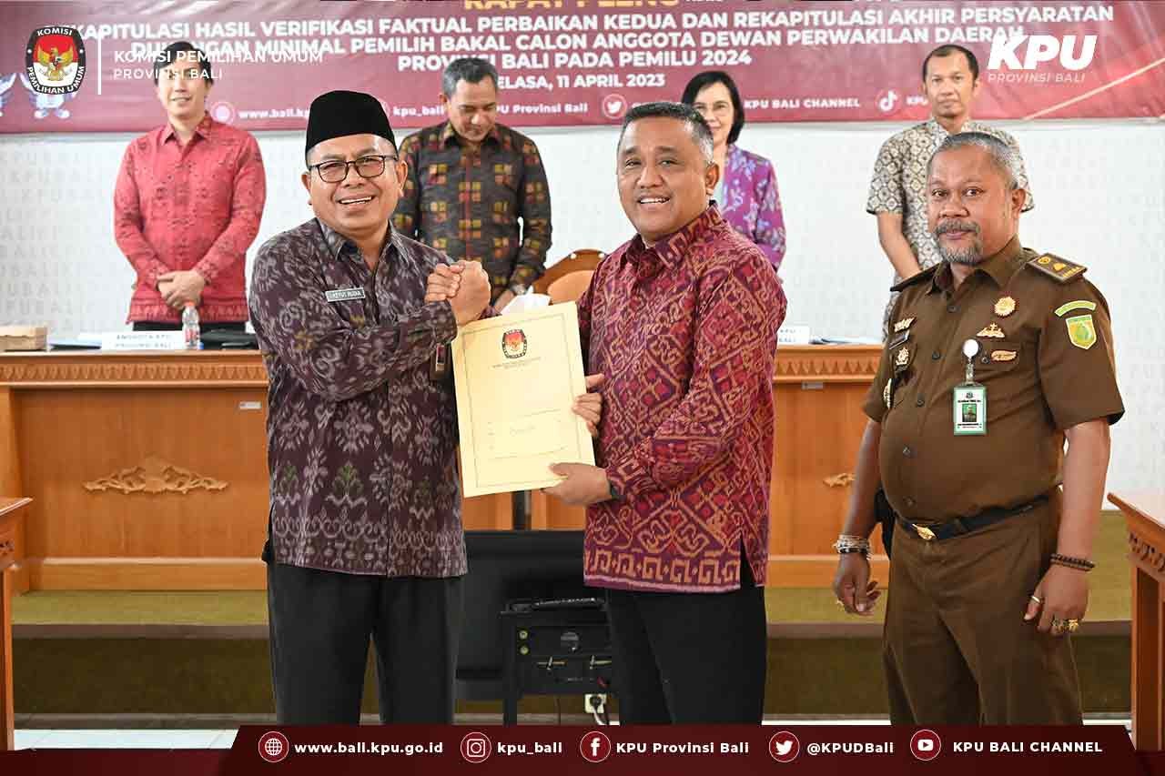 Setelah dilakukan verifikasi faktual (verfak)  perbaikan kedua dan penyampaian Berita hasil verfak perbaikan kedua oleh KPU Kabupaten/Kota, pada hari selasa (11/4/2023) KPU Provinsi Bali menetapkan Berita Acara rekapitulasi hasil Verfak perbaikan kedua terhadap empat bakal calon Dewan Perwakilan  Daerah Provinsi Bali yang masih dinyatakan Belum memenuhi syarat pada tahap perbaikan Pertama.