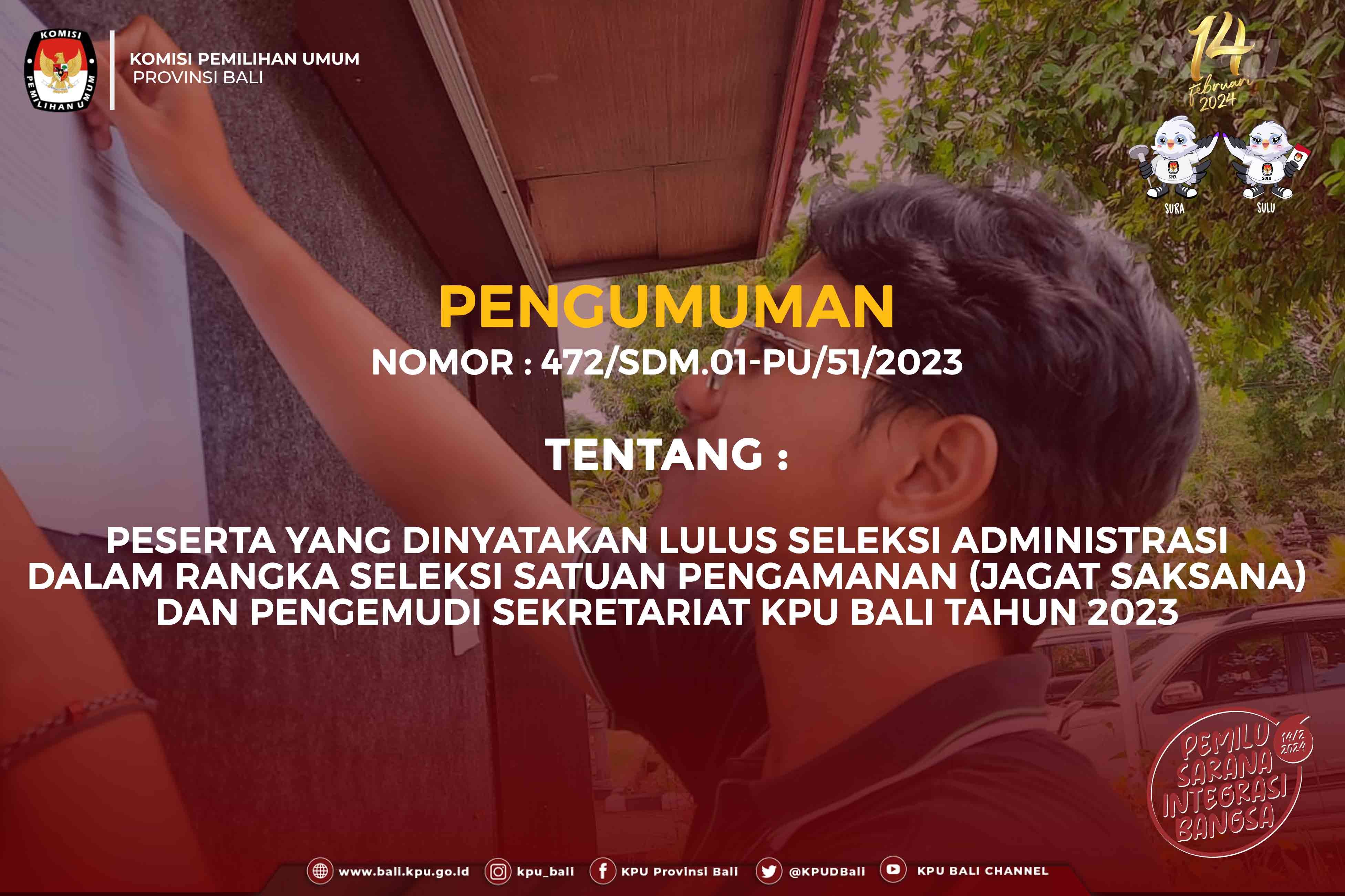 Berdasarkan hasil seleksi berkas pendaftaran yang masuk dalam rangka Seleksi Tenaga Administrasi, Satuan Pengamanan (Jagat Saksana), Pengemudi dan Pramubakti, diumumkan bahwa peserta sesuai lampiran dinyatakan Lulus Seleksi Administrasi dan selanjutnya dapat mengikuti tes Wawancara, dengan membawa bukti pendaftaran dan Kartu Tanda Penduduk (KTP) asli (khusus S1 Komputer membawa laptop yang telah terinstall Adobe Photoshop dan Adobe Premier) pada: