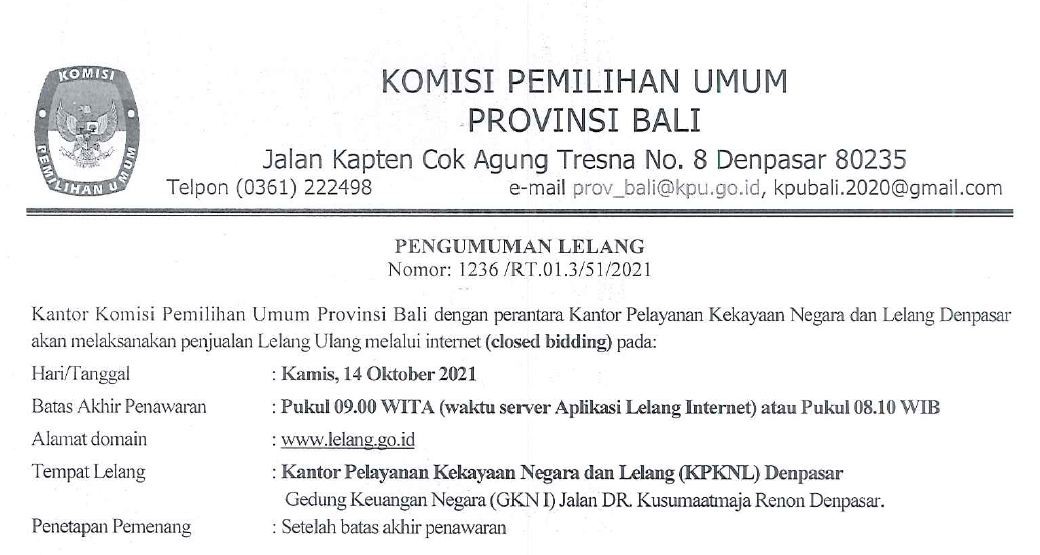Pengumuman Lelang Barang Bergerak Sekretariat KPU Provinsi Bali Jumat, 08 Oktober 2021 00:00 122 Pengumuman Lelang Barang Bergerak Sekretariat KPU Provinsi Bali (Download) Baca Selengkapnya