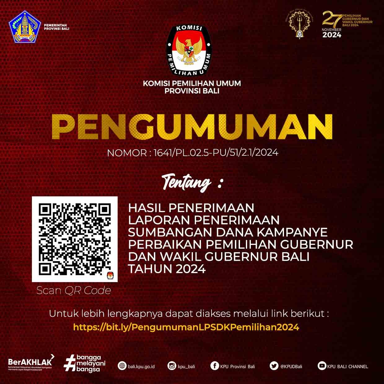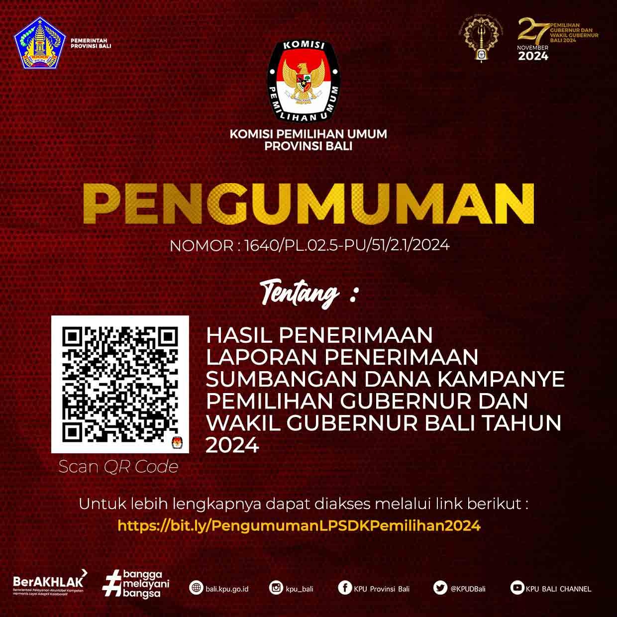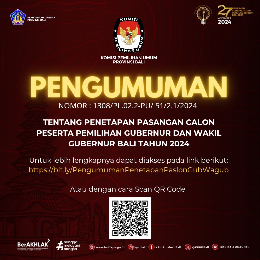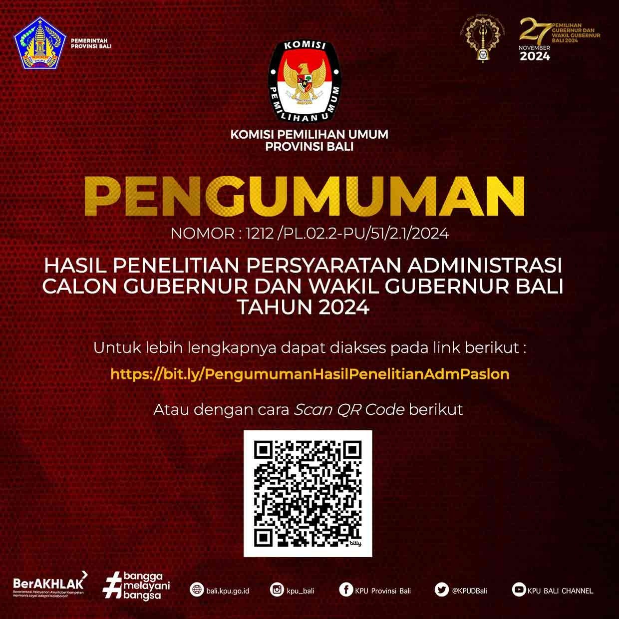 Pengumuman lebih lengkap dapat dilihat melalui link https://bit.ly/PengumumanPenetapanPaslonGubWagub atau dengan Scan QR Code.(ps.red/Foto KPU Bali/ps/hupmas)