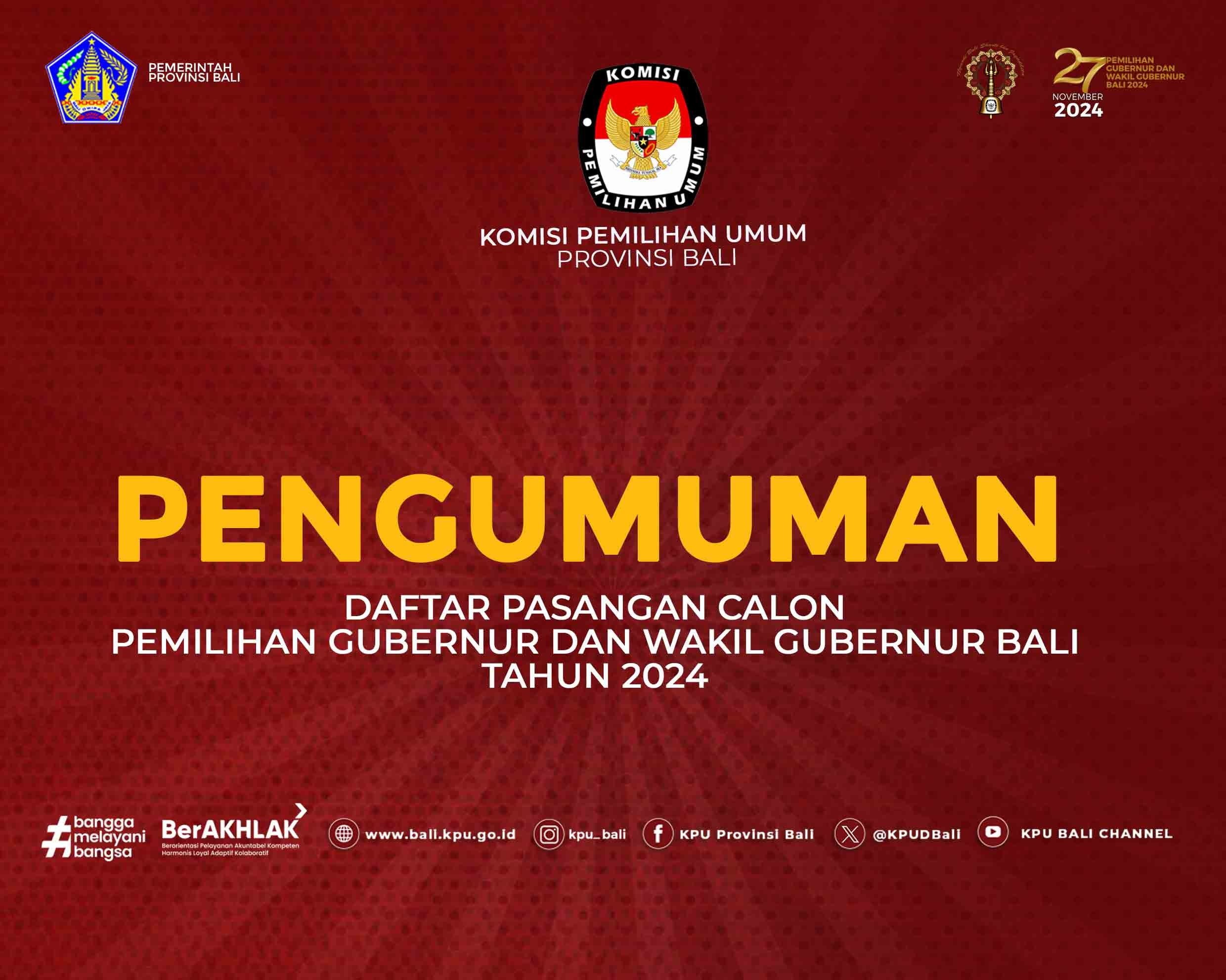 Denpasar. bali.kpu.go.id - Komisi Pemilihan Umum Provinsi Bali mengumumkan hasil Penetapan Pasangan Calon Peserta Pemilihan Gubernur Dan Wakil Gubernur Bali Tahun 2024 (urutan berdasarkan jam dan hari pendaftaran) ditetapkan sebagai Pasangan Calon Gubernur dan Wakil Gubernur Bali Tahun 2024, Minggu, 22/9/2024
