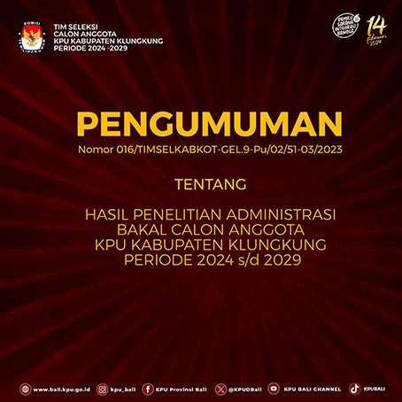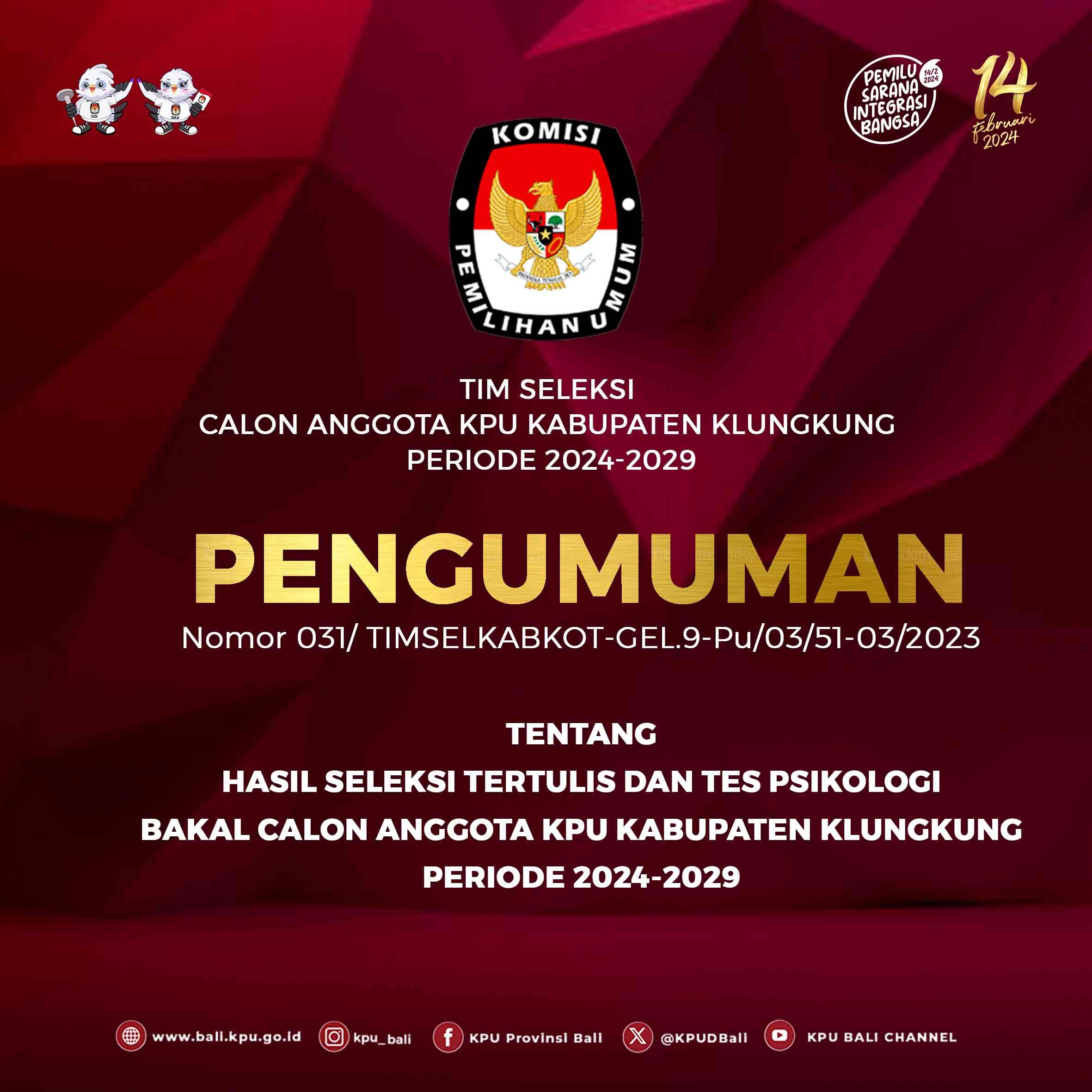 Tim Seleksi Calon Anggota KPU Kabupaten Klungkung Periode 2024 – 2029 mengeluarkan PENGUMUMAN Nomor: 031/ TIMSELKABKOT-GEL.9-Pu/02/51-03/2023 Tentang Hasil Seleksi Tertulis Dan Tes Psikologi Bakal Calon Anggota KPU Kabupaten Klungkung Periode 2024-2029
